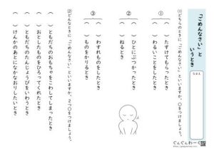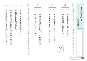 「ありがとう」と「ごめんなさい」 2025.11.28「ありがとう」と「ごめんなさい」をどのような場面で使うかを 学べるワークです。文章はひらがなとカタカナで表記しています。ワークを表示するには、サムネをクリックしてください。もくじありがとうごめんなさいありがとうありがとう1ありがとう2ごめんなさいごめんなさい1ごめんなさい2
